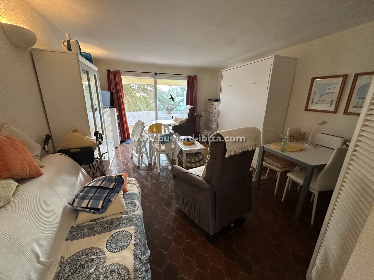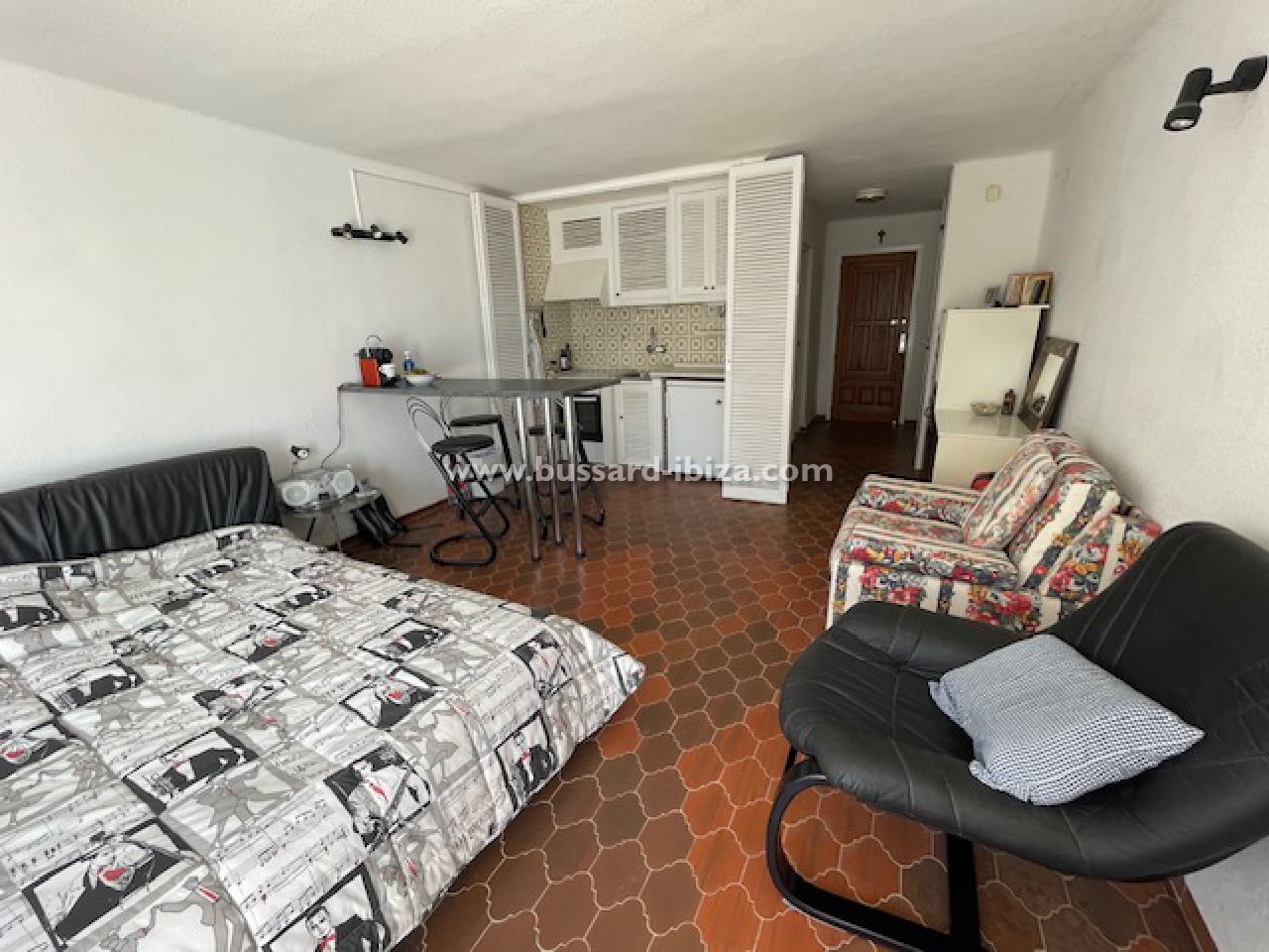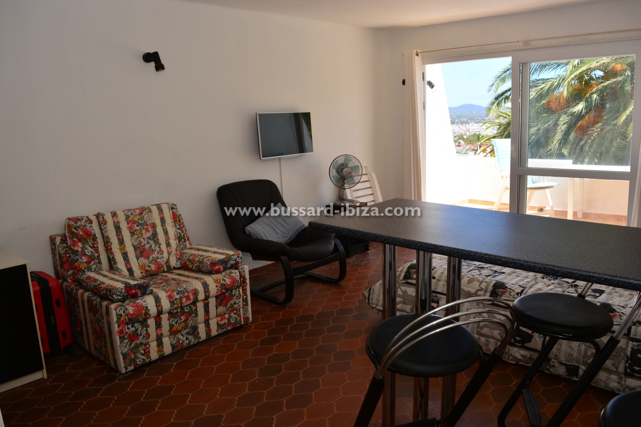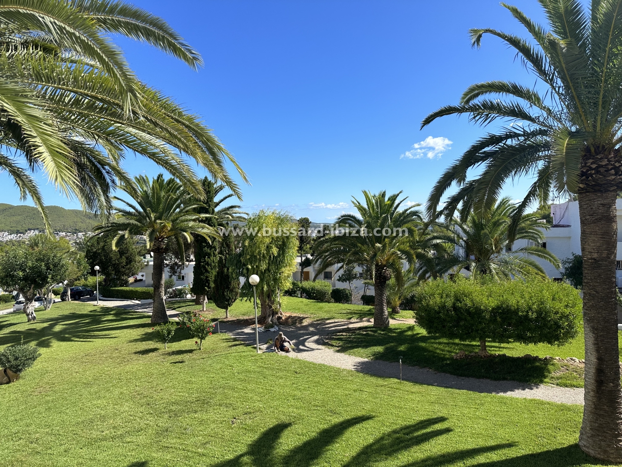 La propiedad se encuentra en una tranquila y urbanizada zona, a solo 1 km de Santa Eulalia del Río y a 2 km de Cala Llonga. La urbanizacion Miramar tiene unos bonitos y cuidados jardinecomunitarios, 2 piscinas y una piscina infantil. Estudio de unos 35 m² situado en la planta superior con vistas panorámicas a Santa Eulalia del Río, se distribuye en salón-comedor, cocina, 1 baño y terraza.