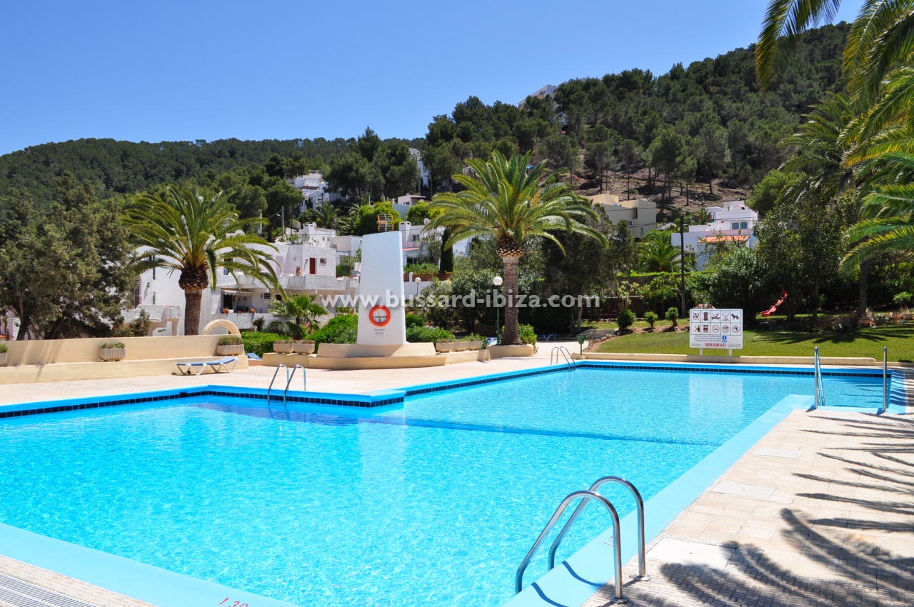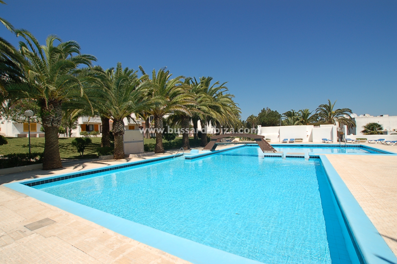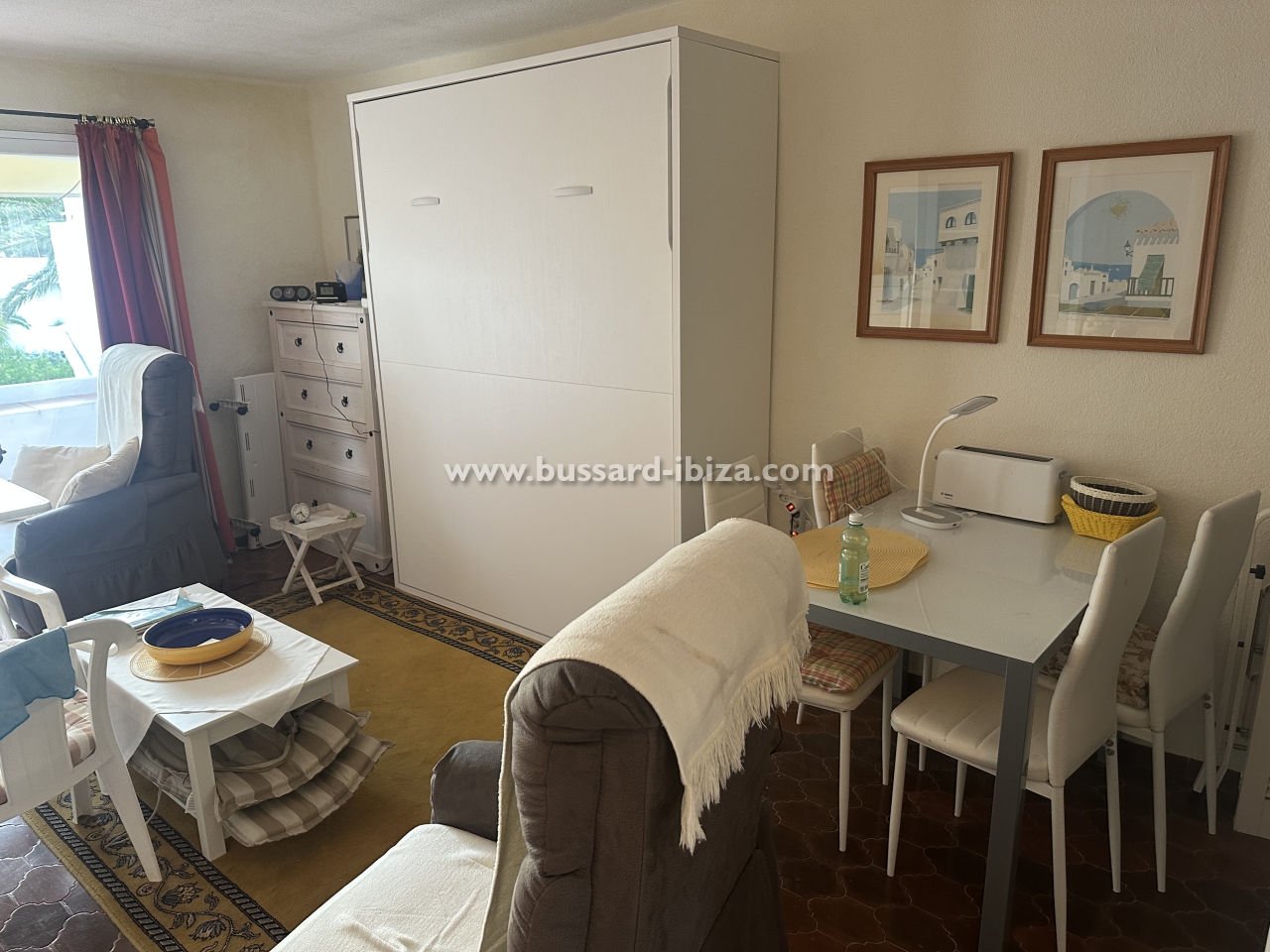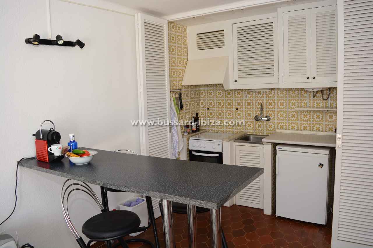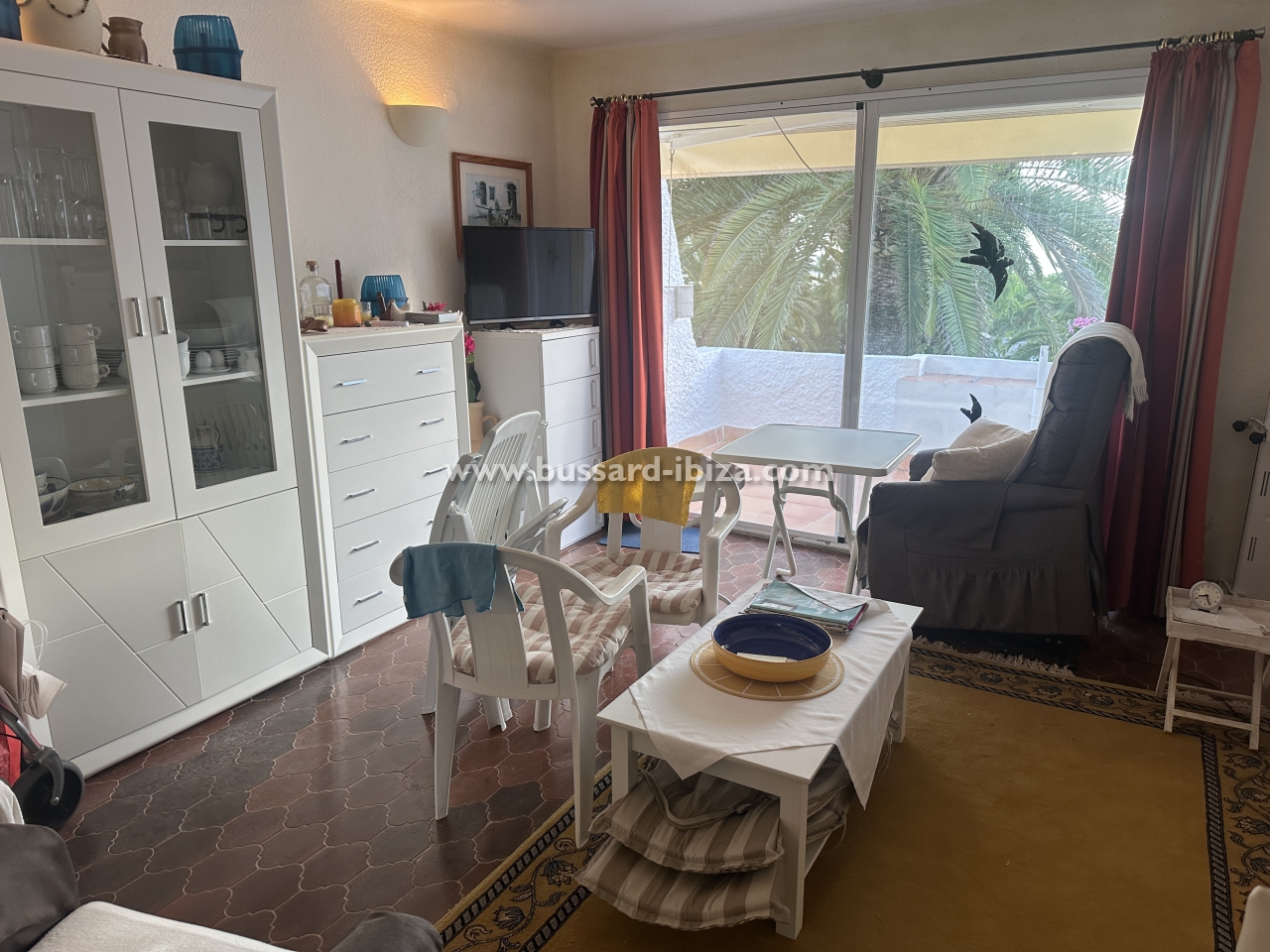 La propiedad se encuentra en una tranquila y urbanizada zona, a solo 1 km de Santa Eulalia del Río y a 2 km de Cala Llonga. La urbanizacion Miramar tiene unos bonitos y cuidados jardinecomunitarios, 2 piscinas y una piscina infantil. Estudio de unos 35 m² situado en la planta superior con vistas panorámicas a Santa Eulalia del Río, se distribuye en salón-comedor, cocina, 1 baño y terraza.