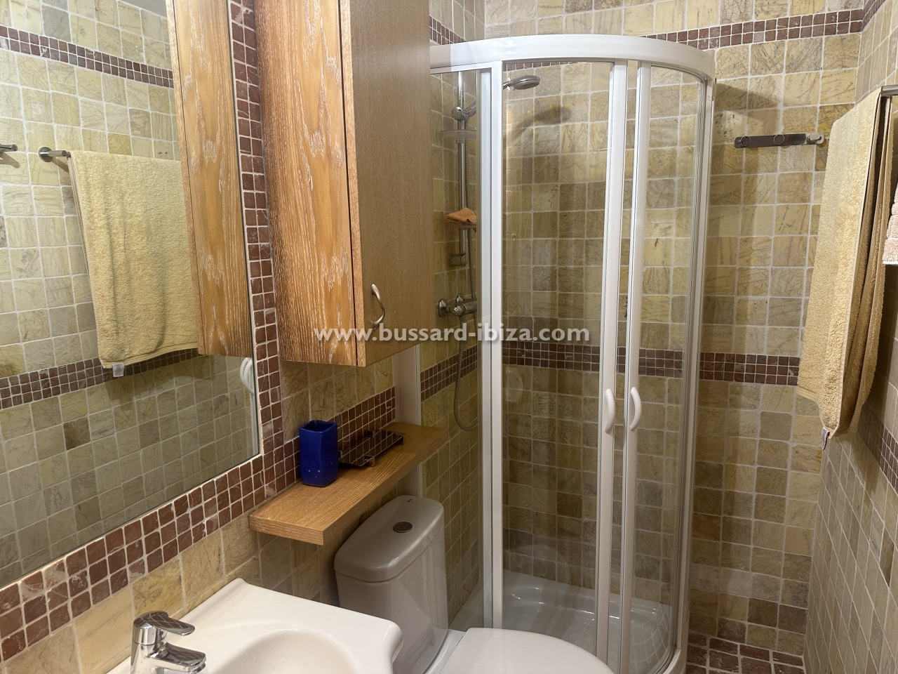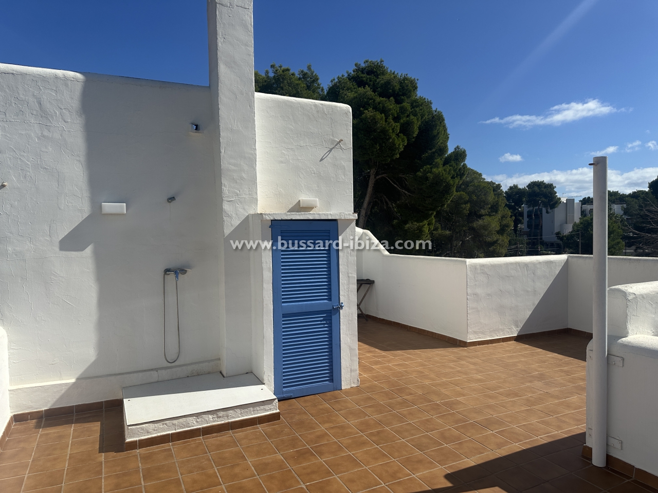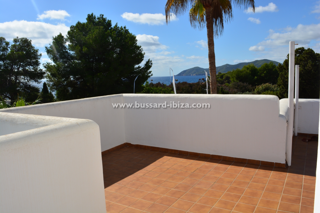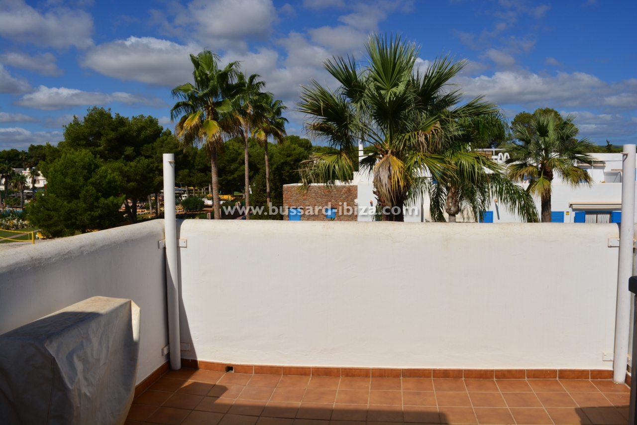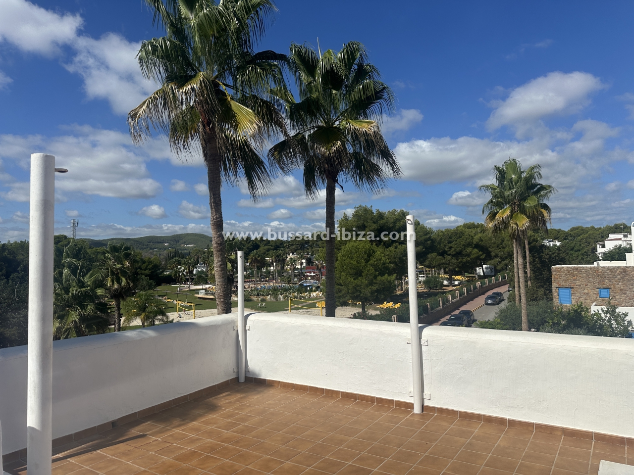 Beautiful apartment located in a nice and quiet area between Santa Eulalia and Es Canar. The urbanisation has just a few apartments, very well kept garden and a communal pool. +/-100m² distributed in 2 bedrooms, 2 bathrooms, open kitchen to living-dining room, 2 terraces and a roof terrace ( 65m² ). Panoramic sea view and just 50m from the beach.