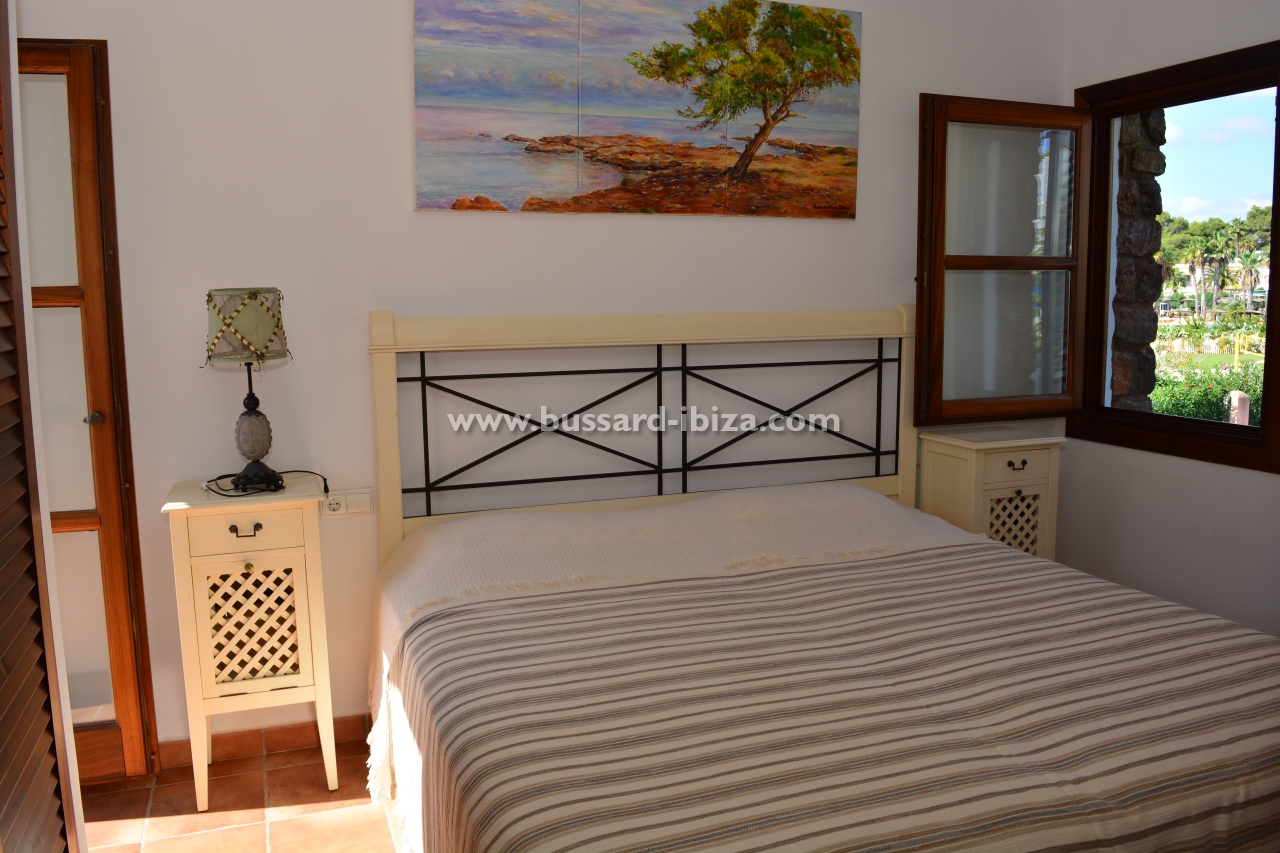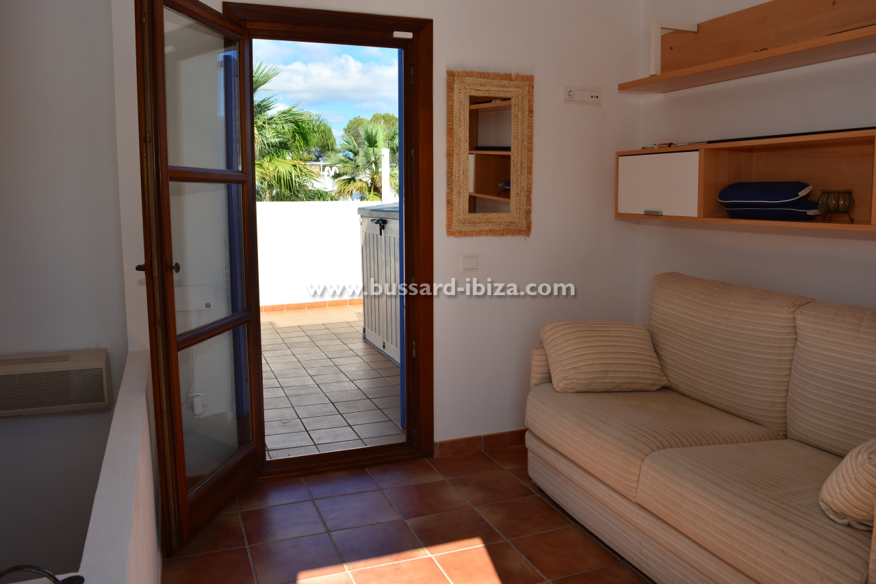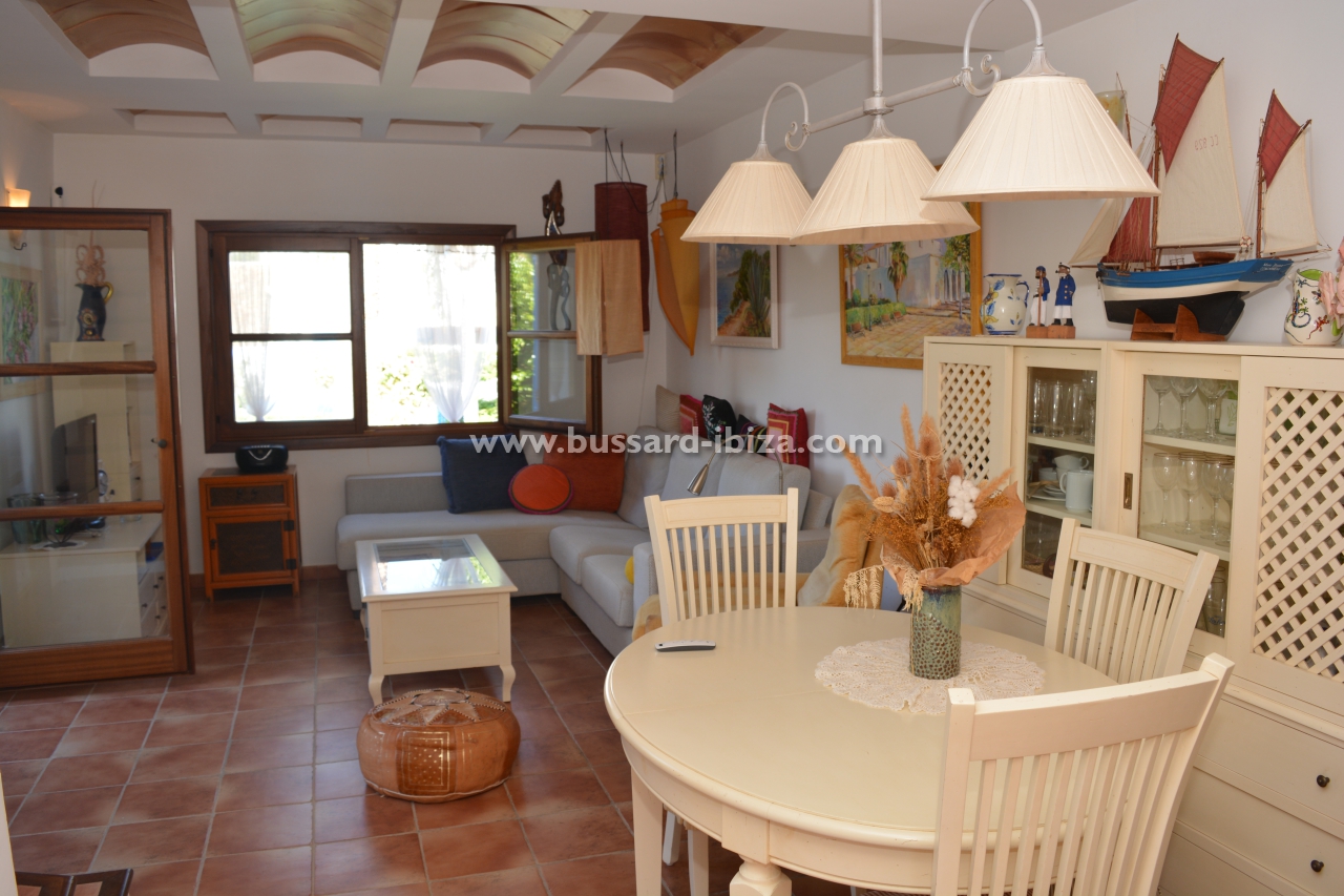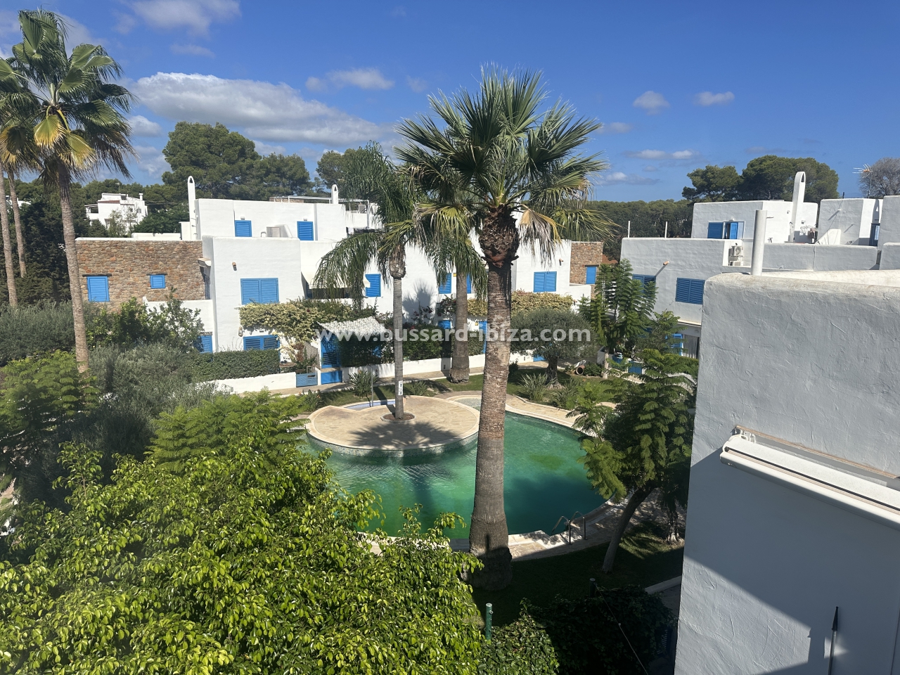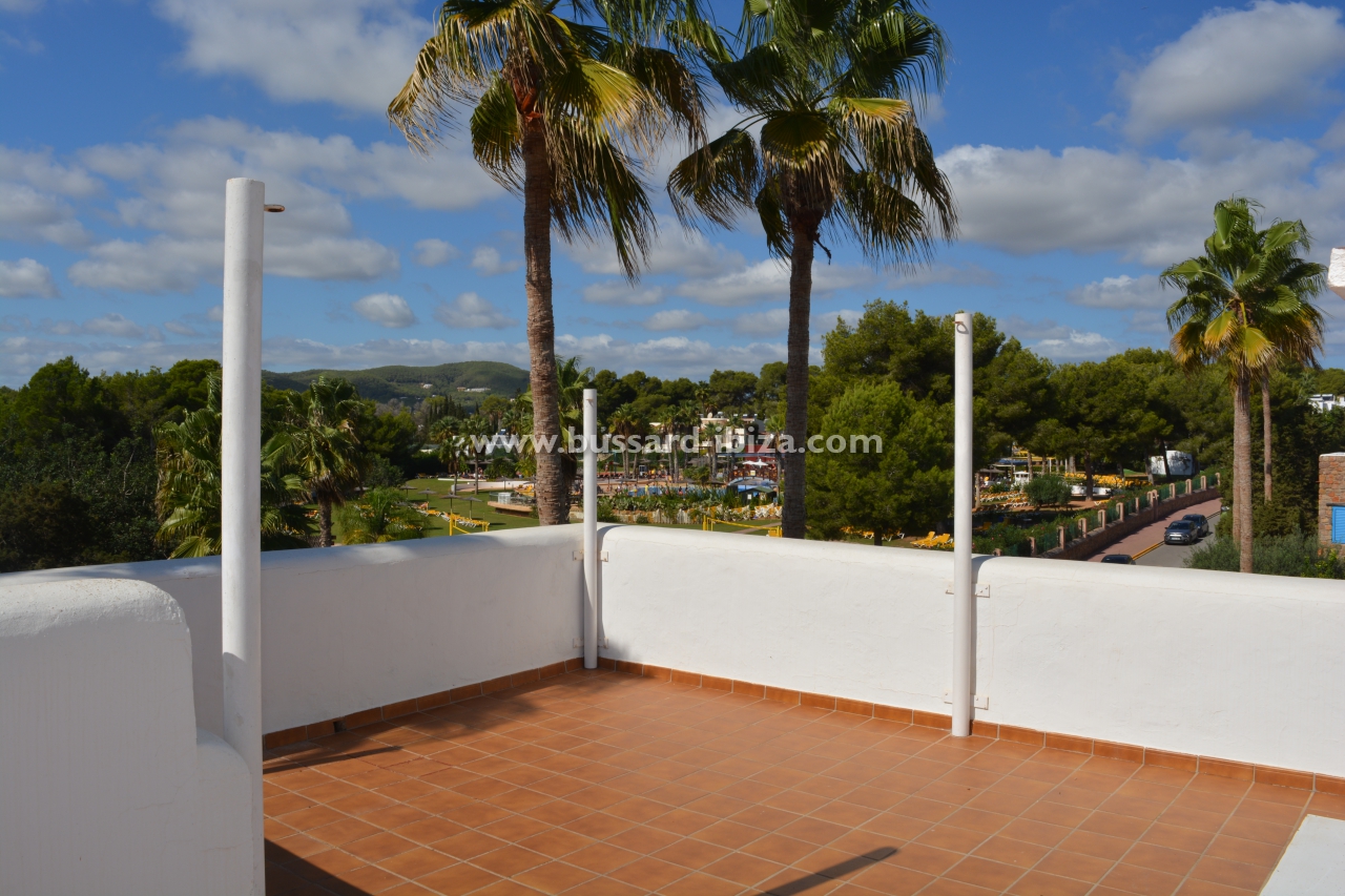 Beautiful apartment located in a nice and quiet area between Santa Eulalia and Es Canar. The urbanisation has just a few apartments, very well kept garden and a communal pool. +/-100m² distributed in 2 bedrooms, 2 bathrooms, open kitchen to living-dining room, 2 terraces and a roof terrace ( 65m² ). Panoramic sea view and just 50m from the beach.