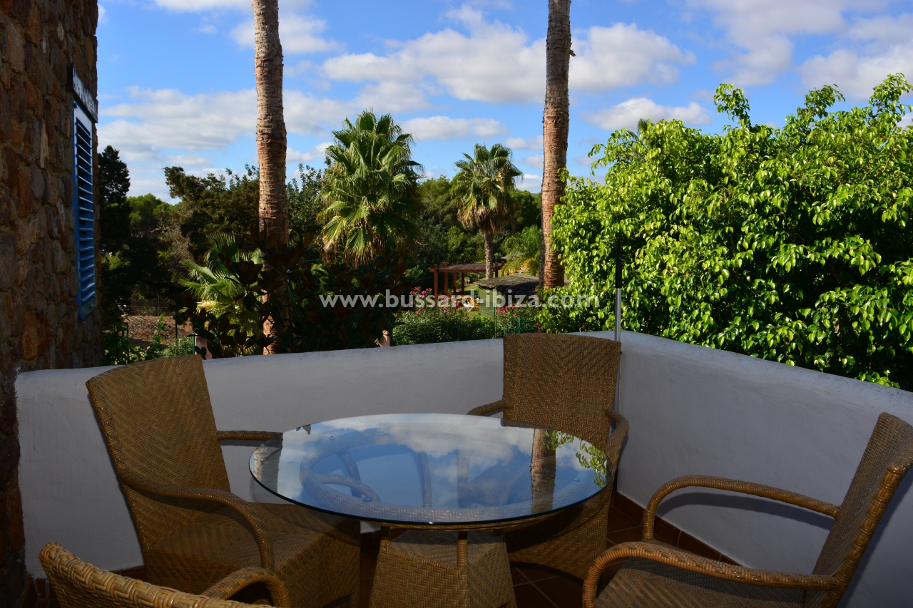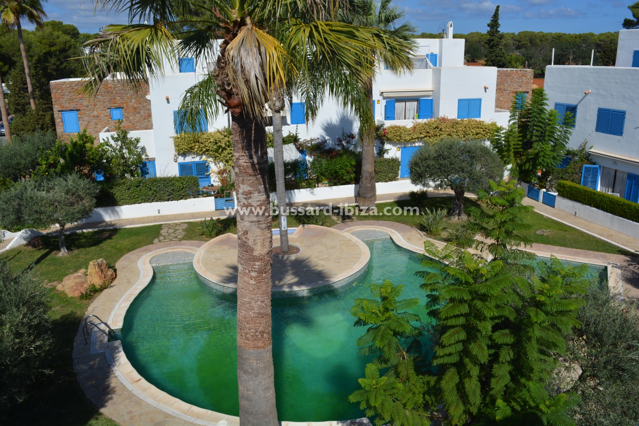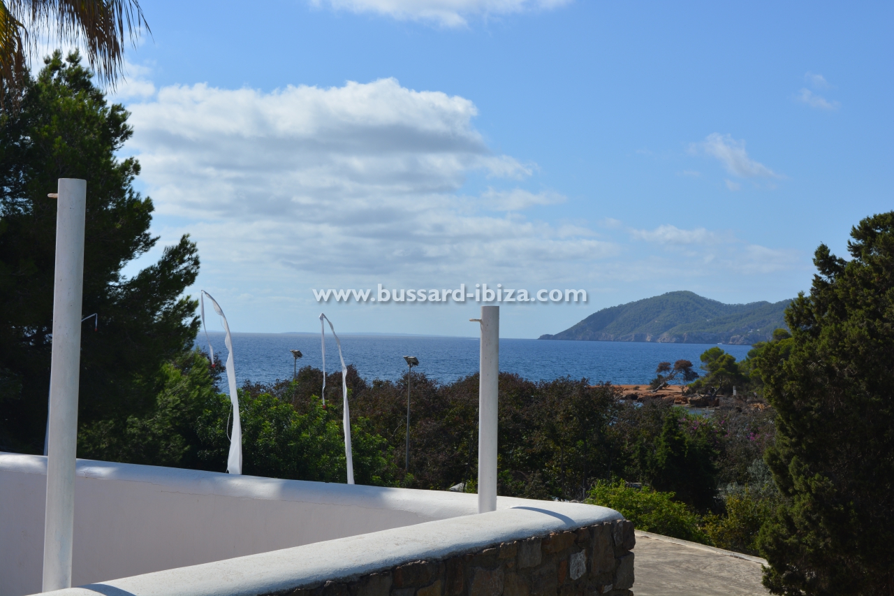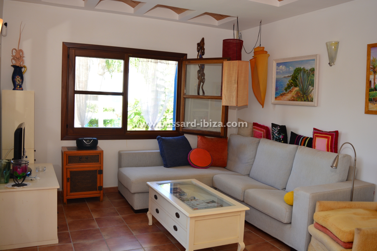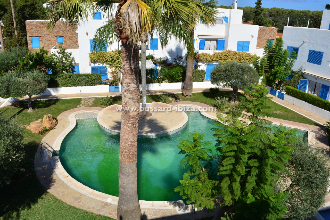 Beautiful apartment located in a nice and quiet area between Santa Eulalia and Es Canar. The urbanisation has just a few apartments, very well kept garden and a communal pool. +/-100m² distributed in 2 bedrooms, 2 bathrooms, open kitchen to living-dining room, 2 terraces and a roof terrace ( 65m² ). Panoramic sea view and just 50m from the beach.