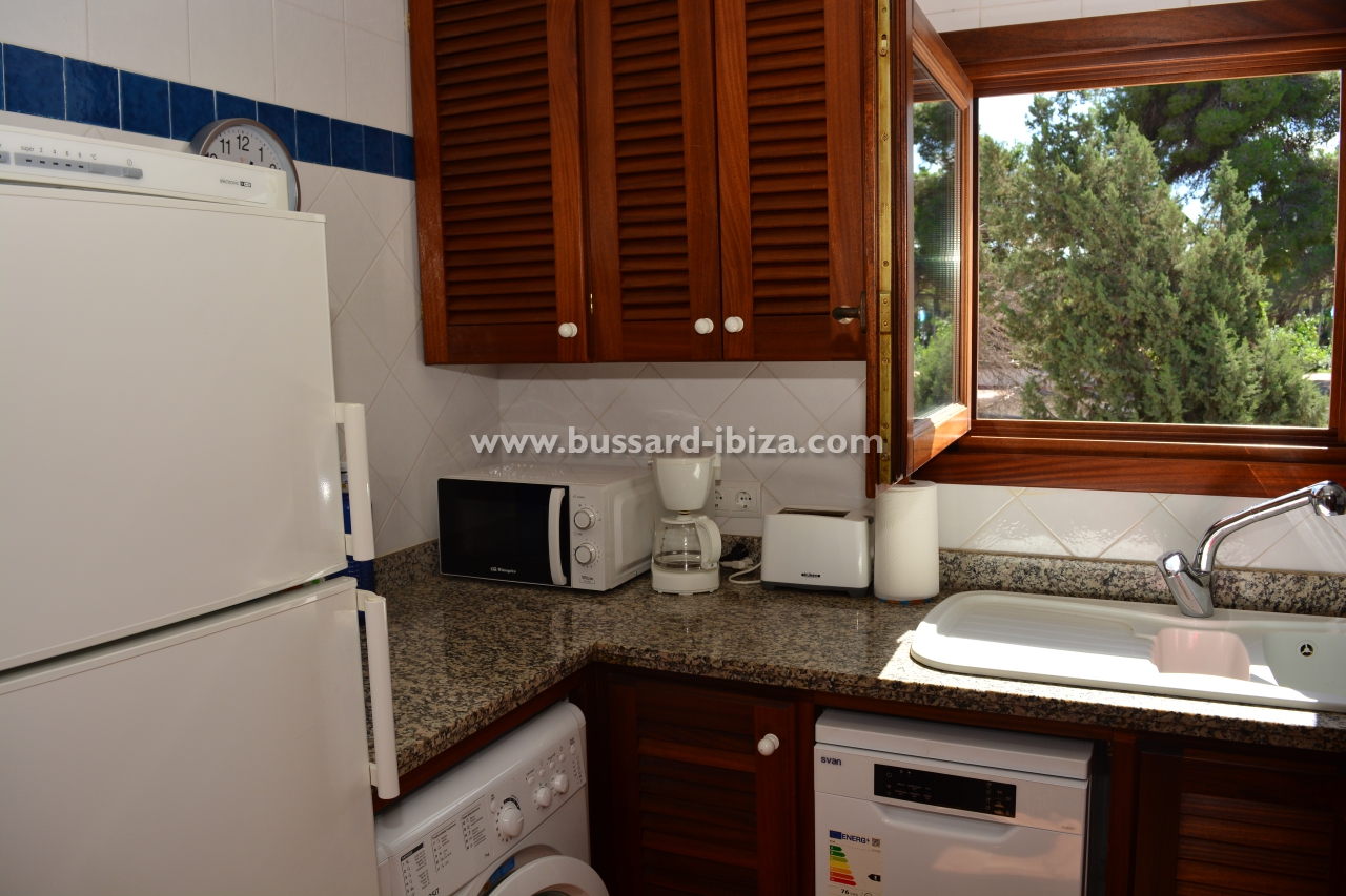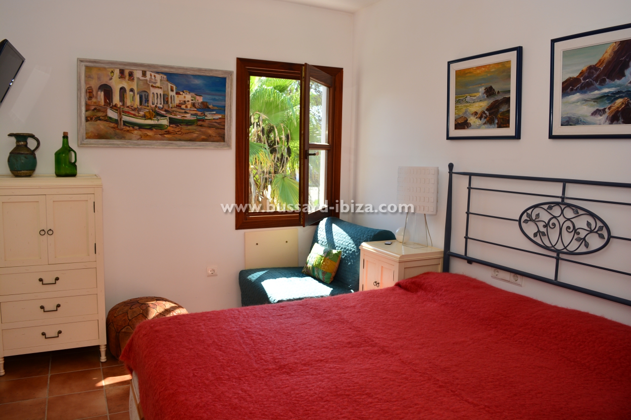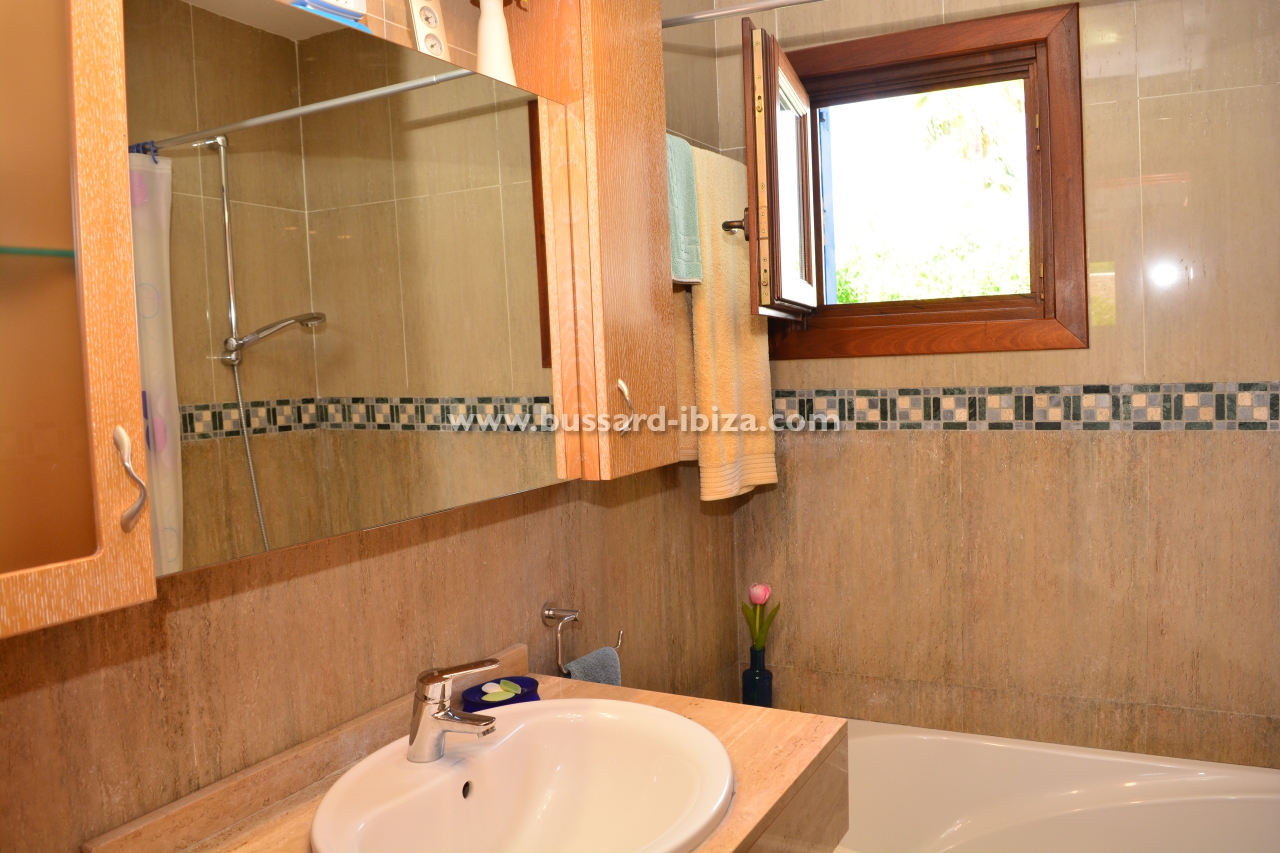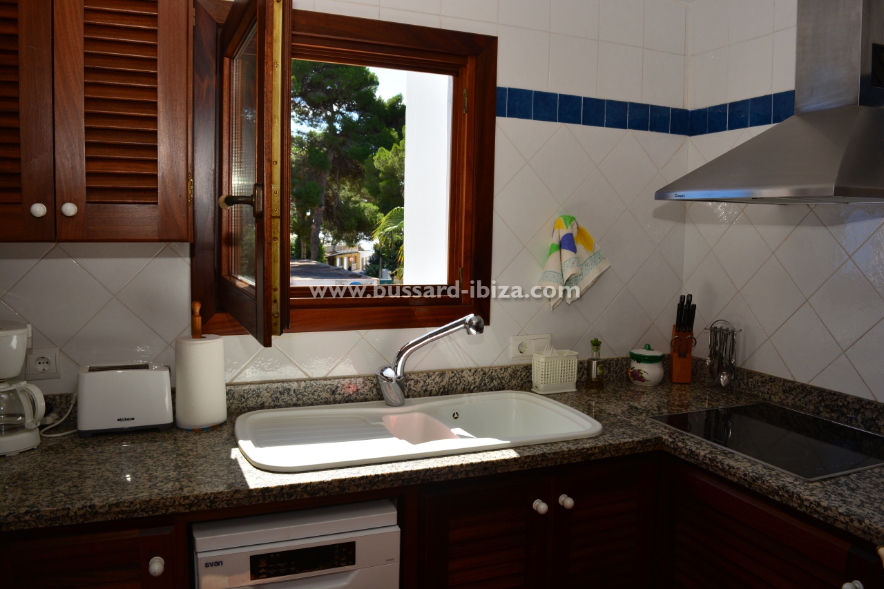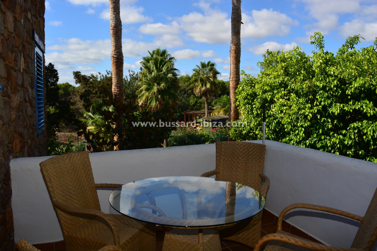 Beautiful apartment located in a nice and quiet area between Santa Eulalia and Es Canar. The urbanisation has just a few apartments, very well kept garden and a communal pool. +/-100m² distributed in 2 bedrooms, 2 bathrooms, open kitchen to living-dining room, 2 terraces and a roof terrace ( 65m² ). Panoramic sea view and just 50m from the beach.