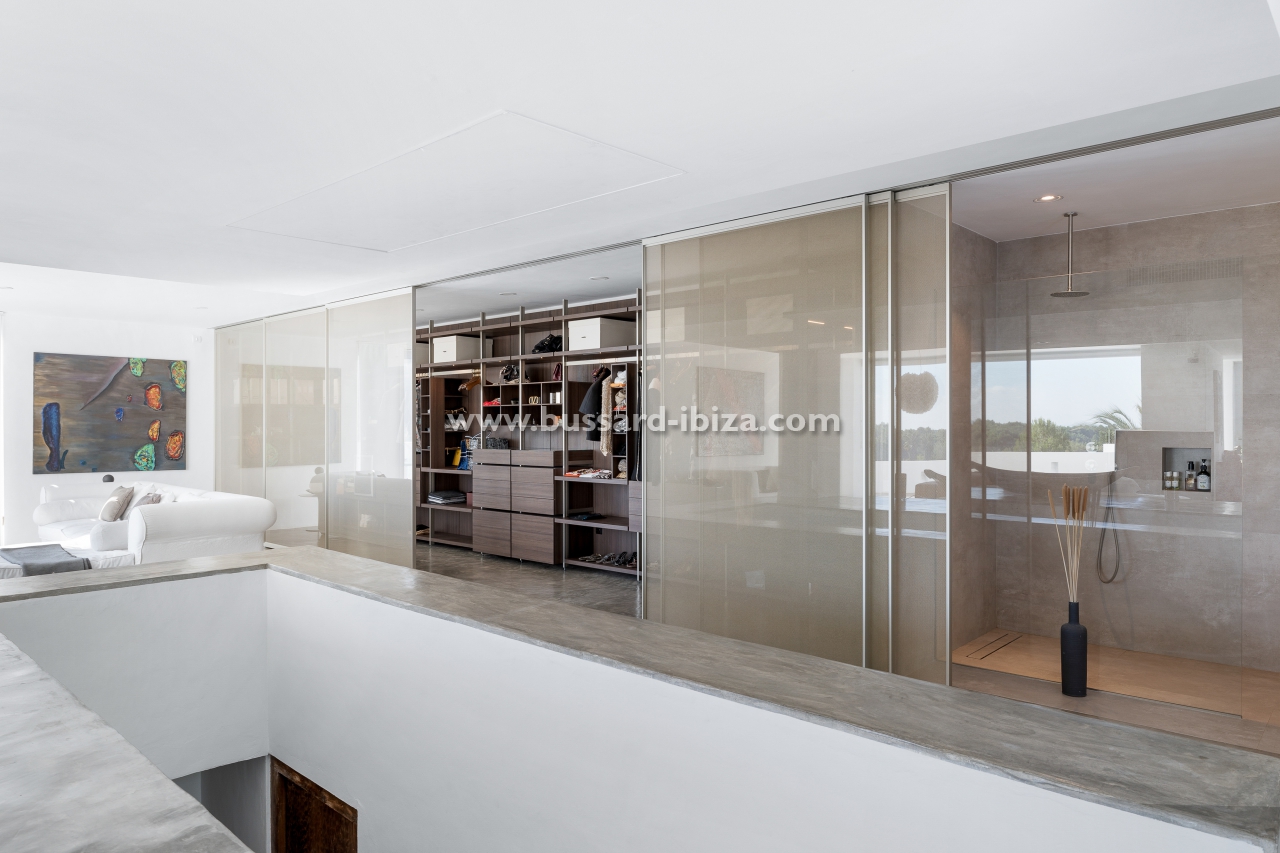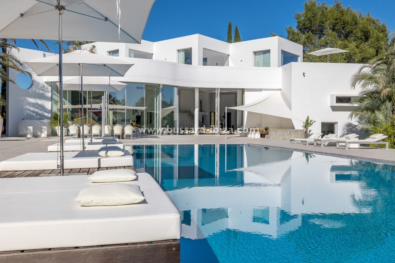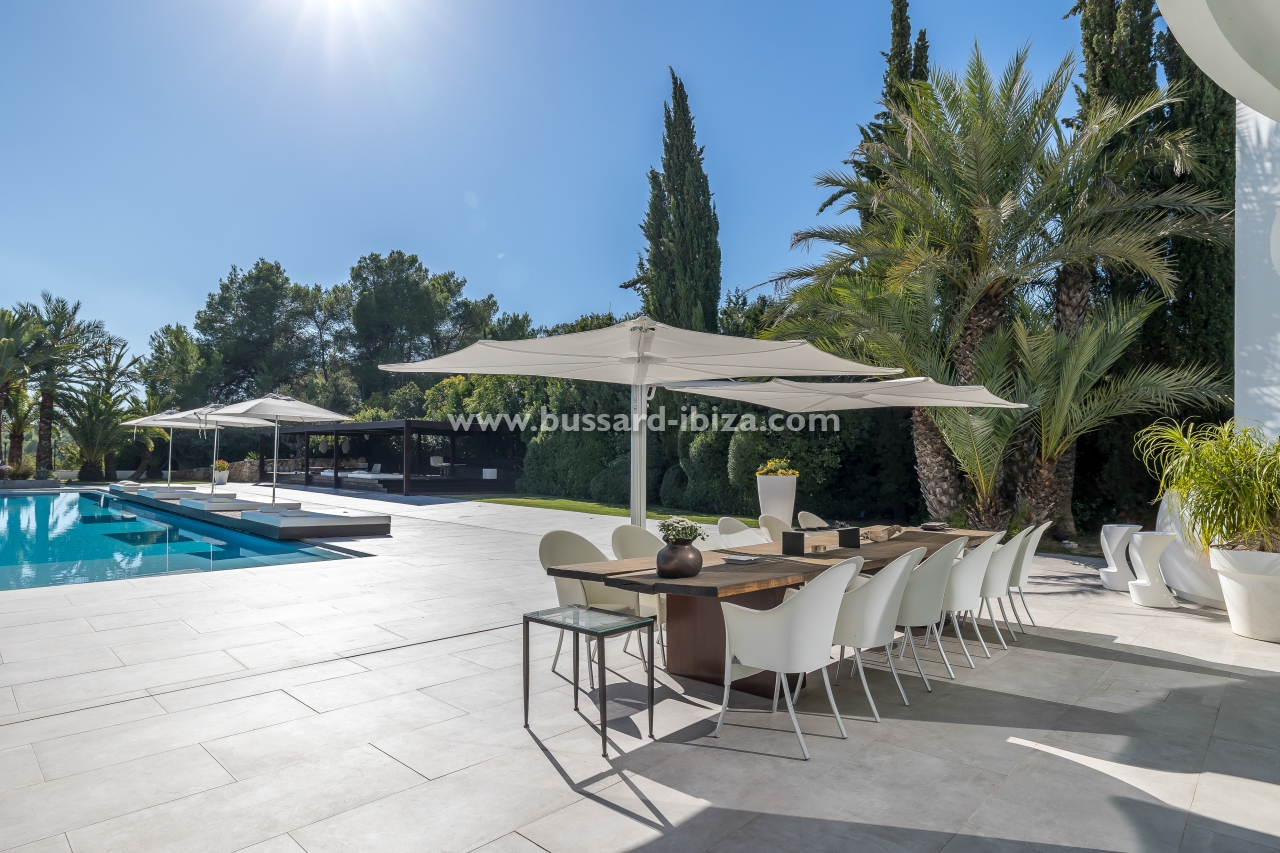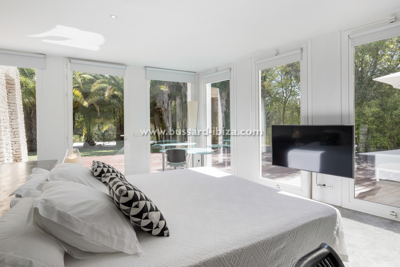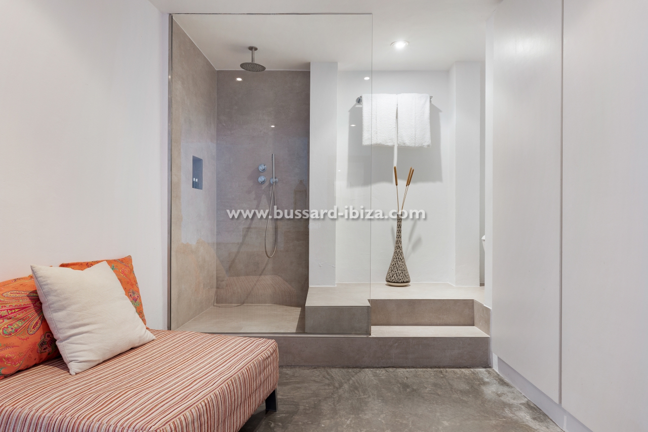 Moderne und schöne Villa im Herzen von Ibiza, im Santa Gertrudis Dorf. Das Haus bietet eine besondere Atmosphäre durch seine individuelle Einrichtung und geschmackvolle Kunst. Das Haupthaus verfügt über ein geräumiges und helles Wohnzimmer mit Zugang zur Terrasse und hohen Decken, eine moderne und bestens ausgestattete Küche mit allen Geräten, ein Hauptschlafzimmer mit Bad en suite, privater Terrasse und Meerblick, sowie drei weitere Schlafzimmer (mit Kingsize-Betten) und jeweils eigenem Bad. Drei Gästezimmer alle mit eigenem Badezimmer und separatem Eingang stehen ebenfalls zur Verfügung. Zur Ausstattung gehören eine offene und überdachte Terrasse, ein Salzwasserpool, ein beheizter Innenpool mit Whirlpool, ein Tennisplatz, Klimaanlage, Fußbodenheizung, Internetanschluss und ein eigener Brunnen. Die Villa ist geschmackvoll und funktional eingerichtet und komplett ausgestattet. Gute Qualität