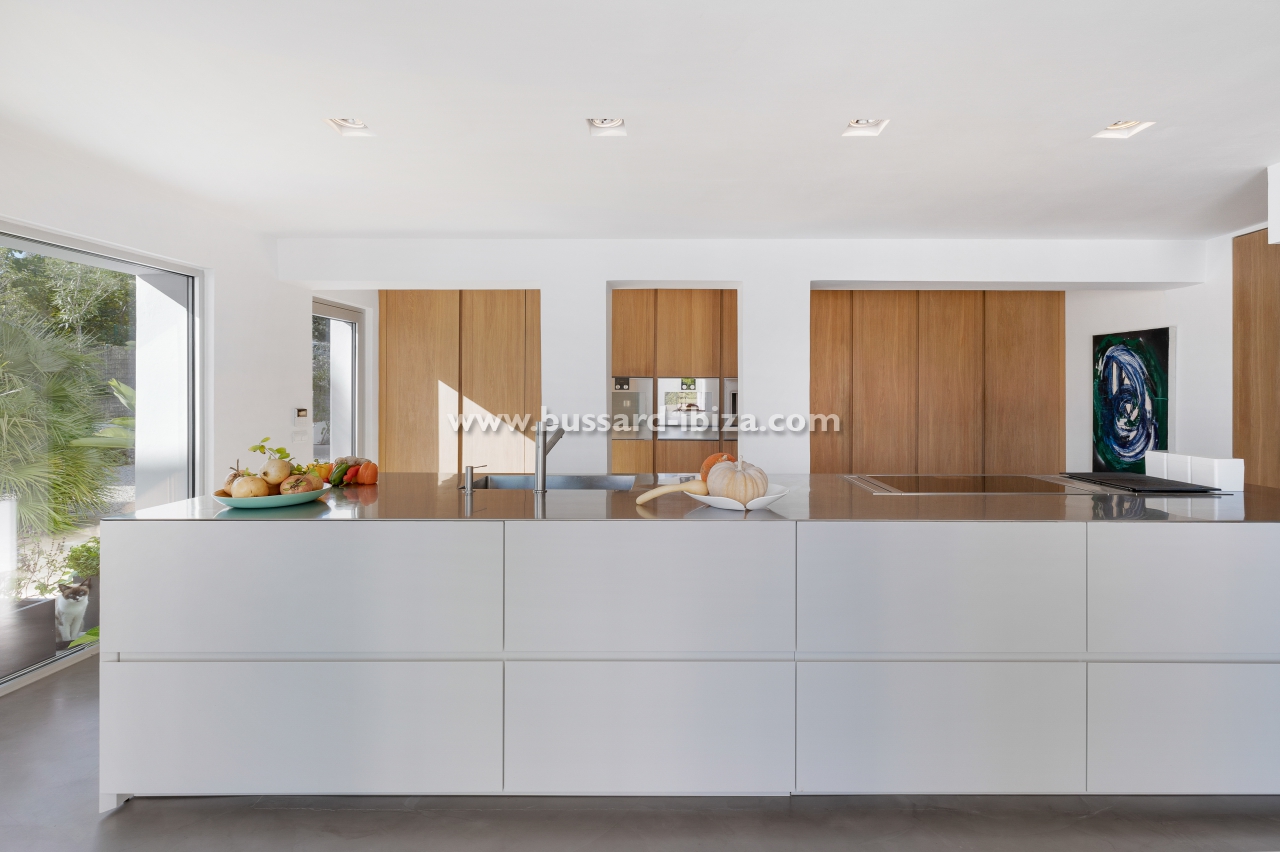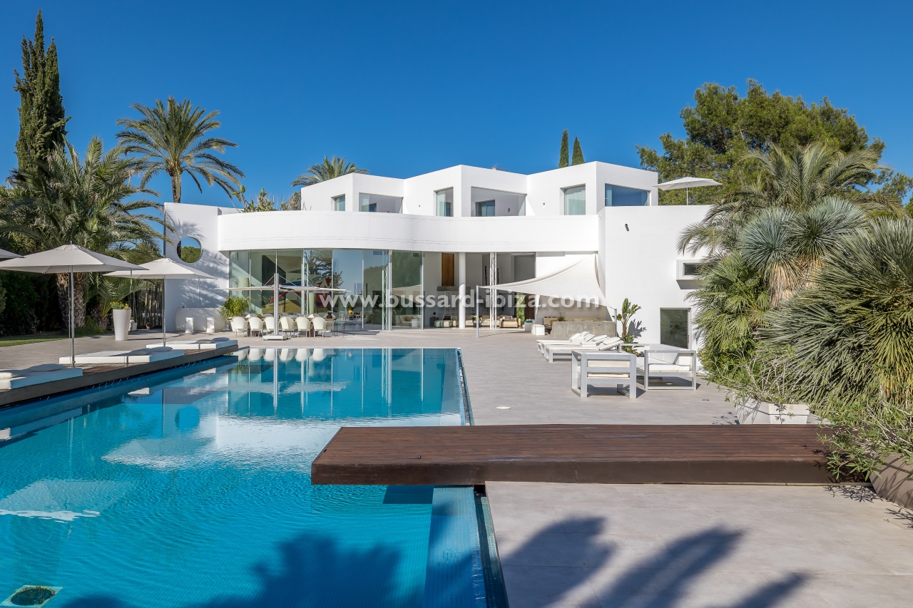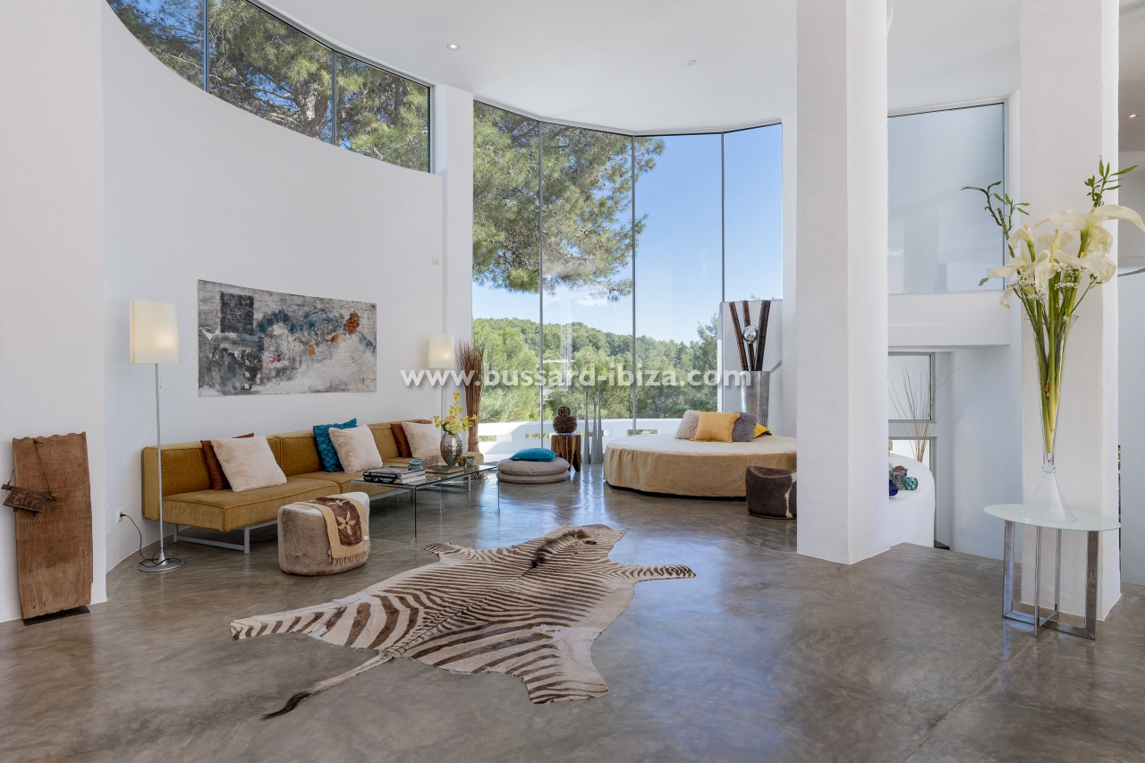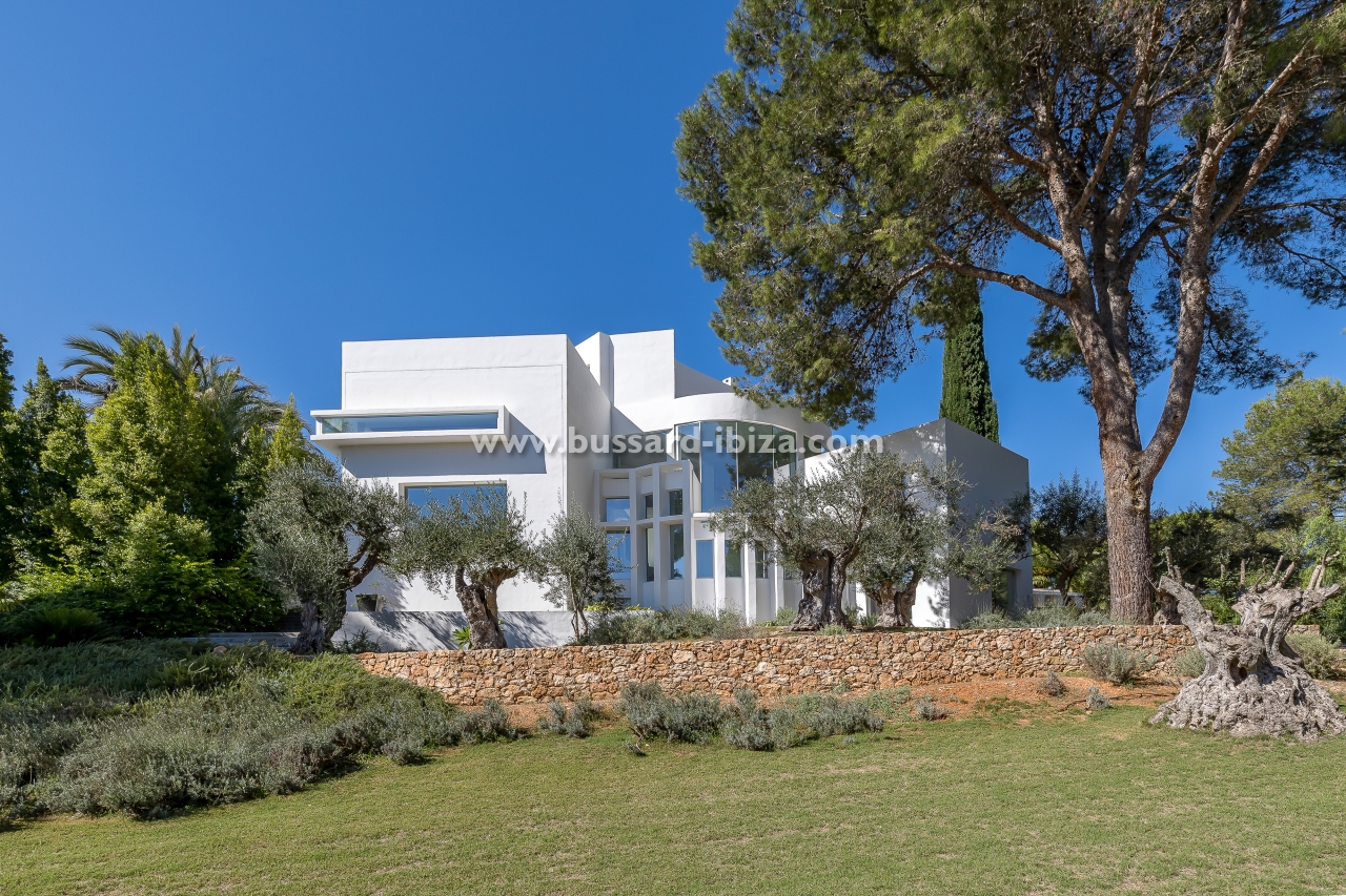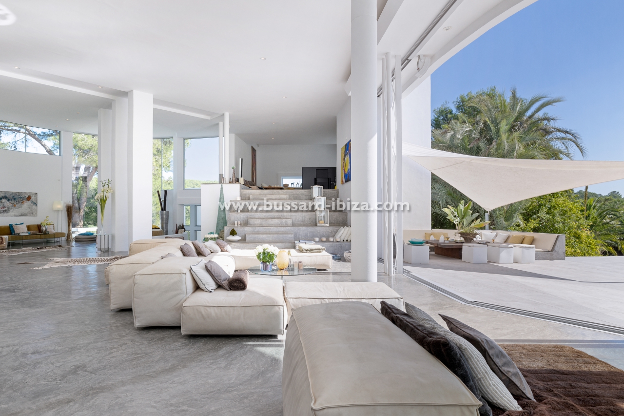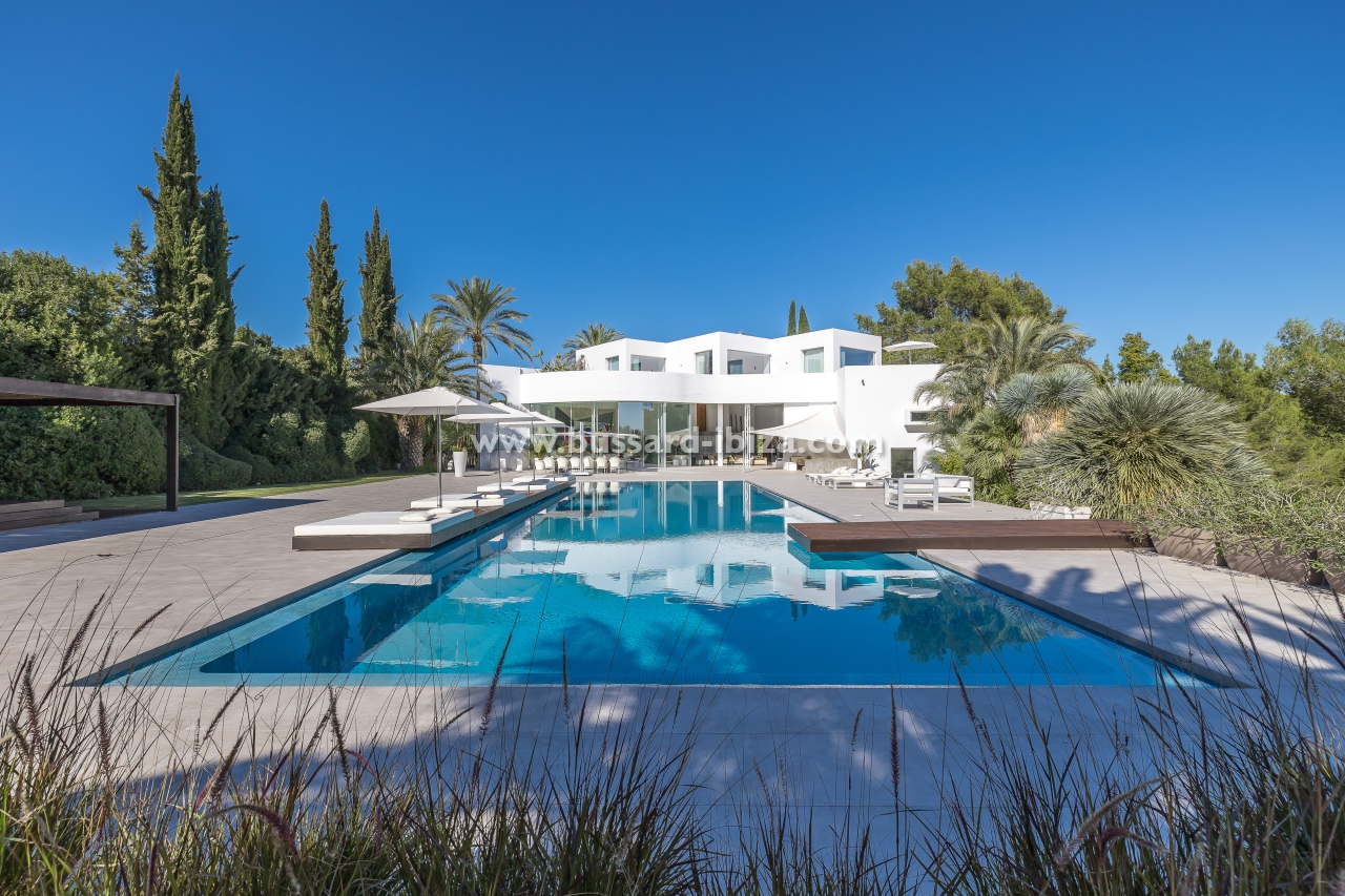 Moderne und schöne Villa im Herzen von Ibiza, im Santa Gertrudis Dorf. Das Haus bietet eine besondere Atmosphäre durch seine individuelle Einrichtung und geschmackvolle Kunst. Das Haupthaus verfügt über ein geräumiges und helles Wohnzimmer mit Zugang zur Terrasse und hohen Decken, eine moderne und bestens ausgestattete Küche mit allen Geräten, ein Hauptschlafzimmer mit Bad en suite, privater Terrasse und Meerblick, sowie drei weitere Schlafzimmer (mit Kingsize-Betten) und jeweils eigenem Bad. Drei Gästezimmer alle mit eigenem Badezimmer und separatem Eingang stehen ebenfalls zur Verfügung. Zur Ausstattung gehören eine offene und überdachte Terrasse, ein Salzwasserpool, ein beheizter Innenpool mit Whirlpool, ein Tennisplatz, Klimaanlage, Fußbodenheizung, Internetanschluss und ein eigener Brunnen. Die Villa ist geschmackvoll und funktional eingerichtet und komplett ausgestattet. Gute Qualität